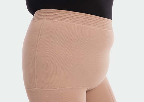 Juzo propose pas moins de huit possibilités différentes au niveau du bord supérieur de la compression. La sélection du bord approprié s'appuie en règle générale sur l'équilibre idéal entre fonctionnalité et préférences personnelles. Ainsi, les patient·e·s avec des hanches généreuses et une taille étroite bénéficient de bords qui peuvent s'ouvrir. Ils sont également de plus en plus utilisés après des opérations ou pour les personnes qui ont des difficultés à l'enfilage ou au retrait en raison de leur force ou de leur capacité à bouger.
